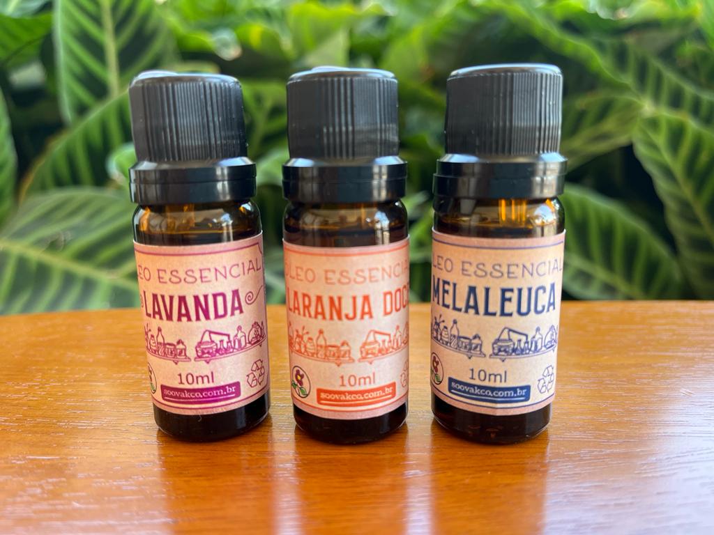Contém: óleo essencial de laranja doce 10ml, óleo essencial de lavanda francesa 10ml, óleo essencial de melaleuca 10ml